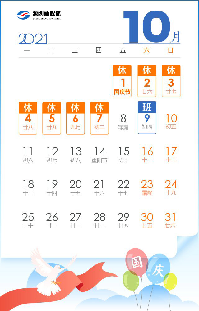 10月1日至7日放假調(diào)休,共7天。9月26日(星期日)、10月9日(星期六)上班