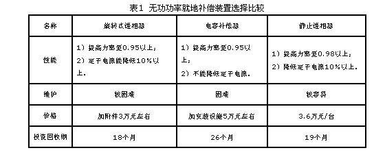 我廠1臺水泥球磨機電機型號為JRQ138-8,電機功率380kW。本系統由于力率低,每月要被電力部門罰款五千多元。經過充分論證后,選用靜止進相器。三種無功就地補償裝置選擇比較見表1。