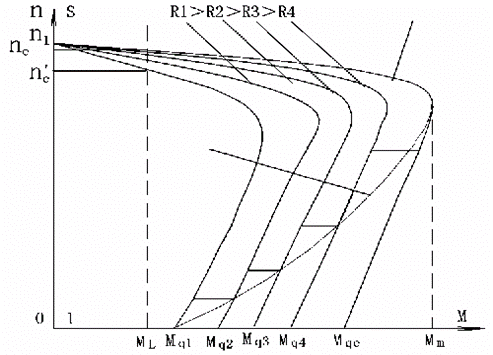 ?。?)圖中起動曲線與橫軸交叉點(Mq1、Mq2、Mq3、Mq4、Mqe)為起動初始電磁轉矩。ML為額定負載轉矩,對應的轉速為電機額定轉速(Ne)。Mm為最大電磁轉矩。