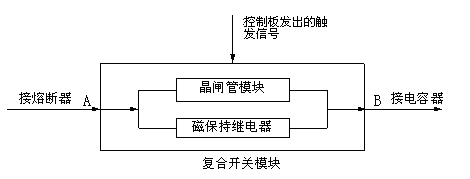 復合開關投入電容器過程:配電綜合控制器發出觸發信號給復合開關,復合開關控制板接到信號后,開始檢測電壓過零點,并在電壓過零時使晶閘管接通主回路,磁保持繼電器經一定延時后,在等電勢情況下吸合。由于晶閘管是無觸點開關,且零電位投入,正常工作后,由于繼電器觸點電阻遠小于晶閘管電阻,電容電流經過磁保持繼電器觸頭進入電網。因而,避免了投電容器時的涌流、拉弧、打火,減小了晶閘管工作損耗。