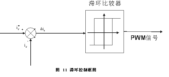 此類控制器中滯環(huán)比較器由于產(chǎn)生的補(bǔ)償電流參考信號(hào)能夠快速準(zhǔn)確地跟蹤諧波電流變化,具有很好的實(shí)時(shí)性,所以在有源濾波器中得到了廣泛的應(yīng)用。滯環(huán)比較器的控制框圖如圖11所示。