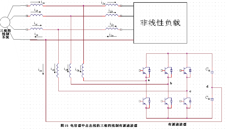 我國380V系統(tǒng)均為三相四線制系統(tǒng),而負(fù)荷通常也為三相四線制即存在中線,因而三相電流之和通常不為零即存在零序電流,零序電流中既可能存在零序基波分量也可能存在零序諧波分量,此時(shí)采用并聯(lián)型三相三線制主電路的電力濾波器無法消除線路中的零序基波電流和諧波電流以及中線中的電流。在許多情況下,為了保持三相電流的平衡,在大型辦公樓中通常會(huì)在三相中合理分配負(fù)荷,使三相電流盡量平衡。但是由于單相負(fù)荷如計(jì)算機(jī)、工作站等信息設(shè)備的大量使用,以及大量設(shè)備是后來增加的,因此實(shí)際中要合理的分配三相負(fù)荷是很難做到的。所以在許多大型的辦公樓出現(xiàn)了三相電流嚴(yán)重不平衡,中線電流很大。并聯(lián)型三相四線制有源電力濾波器就是解決這種非線性不平衡問題和諧波問題的有力手段,圖15所示為目前常見的三相四線制結(jié)構(gòu)的并聯(lián)型有源電力濾波器。直流電容中線點(diǎn)與系統(tǒng)中線相連,全部的中線電流都流經(jīng)直流側(cè)的
