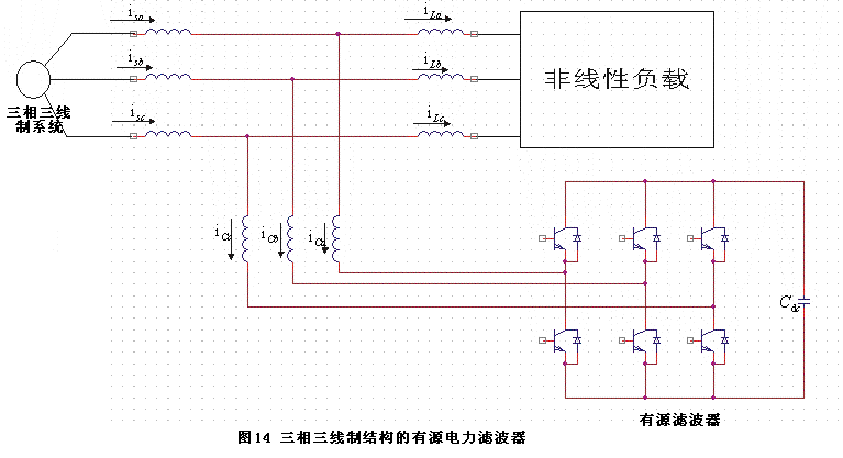接線,因此針對此類負(fù)荷的有源電力濾波器也只需采用三相三線制主電路即可。目前大量功率開關(guān)模塊都已經(jīng)讓三相三橋臂結(jié)構(gòu)制作,因此實(shí)現(xiàn)三相三線制主電路結(jié)構(gòu)非常方便。圖14所示為三相三線制結(jié)構(gòu)的有源電力濾波器。