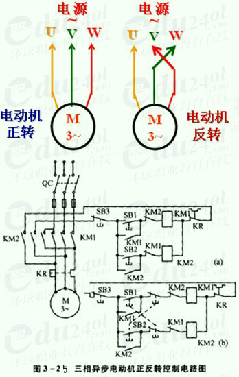 三相異步電動機的正、反轉方法:任意調換電源的兩根進線,電動機反轉。