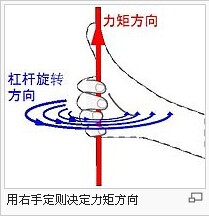 力矩等于作用于杠桿的作用力乘以支點到力的垂直距離。例如,3 牛頓的作用力,施加于離支點2 米處,所產(chǎn)生的力矩,等于1牛頓的作用力,施加于離支點6米處,所產(chǎn)生的力矩。力矩是個矢量。力矩的方向與它所造成的旋轉(zhuǎn)運動的旋轉(zhuǎn)軸同方向。力矩的方向可以用右手定則來決定。假設(shè)作用力垂直于杠桿。將右手往杠桿的旋轉(zhuǎn)方向彎卷,伸直的大拇指與支點的旋轉(zhuǎn)軸同直線,則大拇指指向力矩的方向(如圖2)